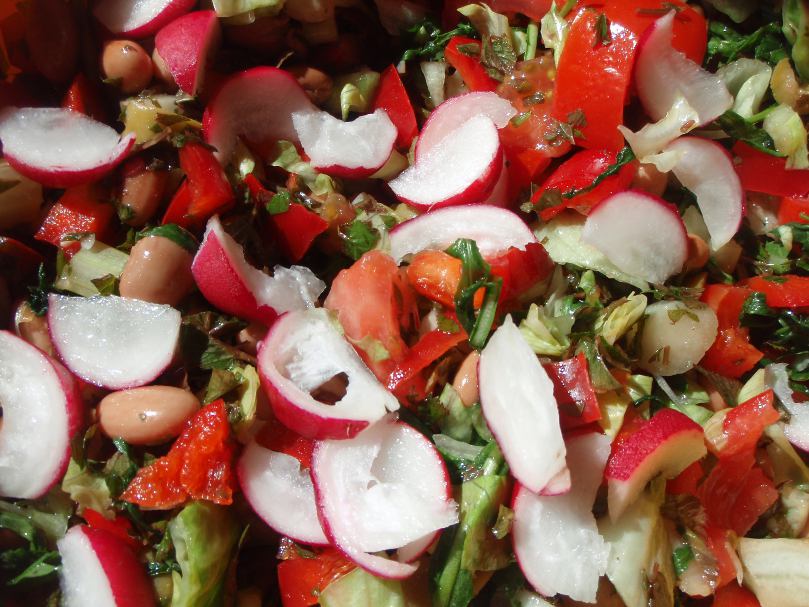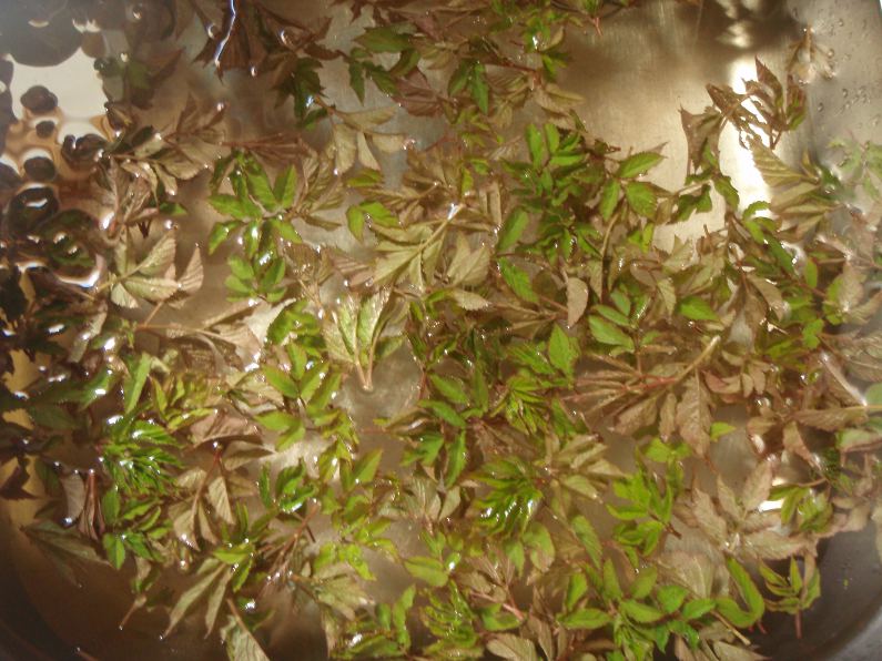 Keräsin vuohenputkea muutaman desin ja huuhtelin. Ensin laitoin ne runsaaseen veteen kellumaan ja sitten vielä huuhtelin ne käsissäni, jotta välttyisin hiekanmuruilta. Sitten silppusin ne ja lisäsin salaattiin. Tämän kertainen salaattini ei ollut mitään megahyvää ja erikoista, ja se oli melkoinen sekoitelma, mutta tiedoksi että siinä oli:
