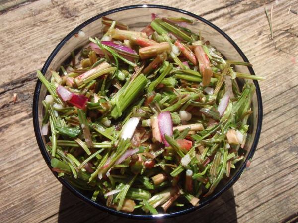 Maasta puskee taas horsmanversoja ja niihin kannattaa tutustua, ovat mukavan napakoita ja maku on kiva. Keräsin niistä yhteen käteen mahtuvan kimpun ja söin raakana. Olen yleensä paistanut niitä pienessä määrässä öljyä ja lisännyt joukkoon timjamia tai muuta yrttiä sekä pippuria ja suolaa. Nyt yrittäessäni syödä enemmän raakaruokaa, silppusin versot huuhtelemisen jälkeen ja laitoin joukkoon: