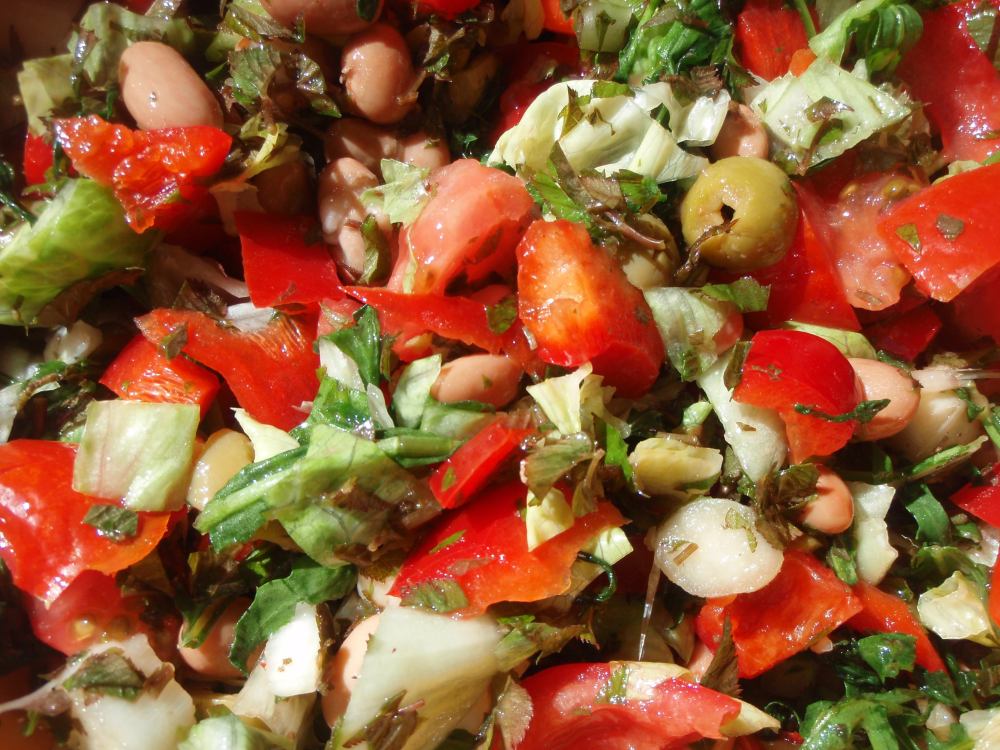 ”Revin tammenlehtisalaatin. Heitän sekaan pienen purkillisen kapriksia. Hmm, tuossa on pala kurkkua ja yksi paprika, kuutioin nekin joukkoon. Jääkaapissa on sienisalaatin jämät, se sopii ihan hyvin maustamaan sekasalaatteja, joukkoon vain. Jaahas, jotain proteiinia tarvitaan, olisikos kaapissa kikhernepurkkia? No ei tällä kertaa, pitää syödä siis enemmän protskua seuraavalla aterialla. Jääkapissa taisi olla aurinkokuivattuja tomaatteja, laitan vähän joukkoon niitäkin, mutta huuhdon ensin turhat öljyt pois.”