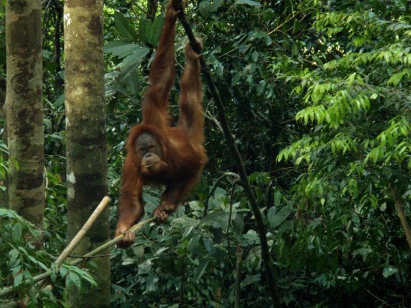 Kansallispuiston kupeessa on orankien suojelukeskus, jossa mm. entisiä lemmikkiorankeja on sopeutettu elämään metsässä. Täysin villejä näistä ihmisten tavoille opetetuista orankeista ei koskaan tule, joten tuossa metsässä orankeja pääsee helposti näkemään opastetuilla patikointiretkillä. Moni kävijä saattaa unohtaa, ettei se ole tavallista orankimetsää ja luulla, että orankeille olisi luontaista tulla ihmisten luo hakemaan banaaneja. En tiedä, olisiko niiden erityisesti parempi olla, jos patikoijat eivät tulisi niitä katsomaan. Että oppisivatko ne paremmin elämään metsässä ilman vierailijoita. Ehkäpä tapaamamme Mina-niminen oranki protestoikin tätä touhua vastaan, koska se joskus hyökkäilee ihmisiä kohtaan. Todennäköisesti sitä yleisesti pännii, että se joutui elämään vankeudessa ennen takaisin metsään tuomista…