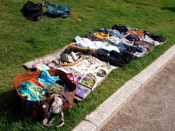 Olen yleensä heittänyt käyttämättömissä olleet vaatteet UFFin keräyslaatikkoon ja tavarat lähistön kierrätyskeskukseen, mutta nyt kesällä kokeilen eka kertaa kirpparimyyntiä. Kirpparin voi laittaa pystyyn vaikka lähipuistoon. Olen huono istuskelemaan puistoissa, koska lukeminen ja tietokoneen räpläys sohvalla on mielestäni mukavampaa. Mutta nyt kokeilin motivoida itseni epämukavaan nurtsilöhöilyyn myymällä samalla tavaroitani. Pari tuntia aurinkoisessa sunnuntaipuistossa tuotti vain yhden asiakkaan. Edellisenä päivänä ilmaisfestarin liepeillä meni kuitenkin paljon paremmin ja kahdeksan tuntia nurtsilla kaveriseurassa meni vikkelästi.