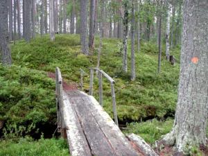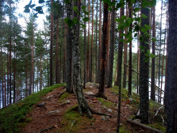 Parkkialueella autossa vietetyn yön jälkeen tallustimme pitkin poikin alueen polkuja. Menimme Harjupolun kautta lähimmälle laavulle Keltasilmään ja takaisin yhteensä ehkä 3 kilometrin pituisen koukkauksen purojen yli menevine siltoineen. Sen jälkeen Korkeasärkän päähän ja takaisin, se on pari kilometriä pitkä kapea ja korkea harjuniemi.