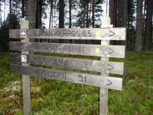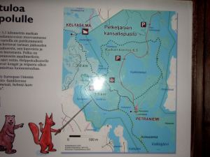 Petkeljärven eteläpäästä alkaa pitempi Taitajan Taival -reitti. Olisi senkin voinut tallustaa Petraniemen leirintäalueelta teltan kanssa, jos vain reitin pohjoispäästä Mekrijärveltä Ilomantsista noin 12 km pohjoiseen olisi jotenkin päässyt takaisin. Se on vähän päälle 30 km pitkä, joten kai se parissa päivässä hoituisi, koska kummoisia korkeuseroja ei tuolla ole.
