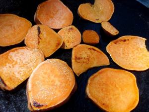 Bataatti on ollut tänä kesänä mieluinen grillattava. Sen kun viipaloi ohuiksi paloiksi, ei tarvita välttämättä muuta kuin paistoöljyä ja suolaa. Vaikka bataatti on tuommoinen kova iso mukula, se pehmenee pannulla aika nopeasti hyväksi syötäväksi. Sen maku on mukavan makea.