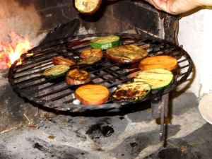 Sateisena iltana kypsensimme bataattia, munakoisoa ja kesäkurpitsaa takassa. Ensin dippasimme viipaleet soijakastikkeen ja öljyn sekoitukseen ja sitten laitoimme ne liekkien päälle paistoritilälle.