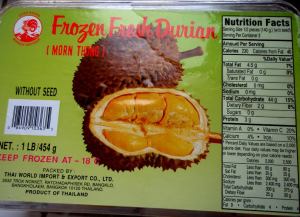 Durian on hedelmäksi aika rasvapitoinen. Mutta herkkuna se vastaa mielestäni lähinnä jäätelön syömistä ja rasvaa siinä on saman verran kuin kevytjäätelöissä (noin 5g/100g). Durian maistuu parhaalle, kun se on pehmeää mössöä. Olen ostanut pakastettuja durianpaloja Hämeentien lempparikaupostani Vii Voanista ja Aseanic Tradingista. Niissä on myös ollut kokonaisia pakastettuja durianeja, mutta ne tulisivat tosi kalliiksi, kun iso osa niiden painosta on kuorta ja hedelmän siemeniä. Nuo pakastetut durianpalat eivät aina ole olleet parhaita mahdollisia, koska pehmeän mössön sijaan ne ovat yleensä osittain olleet semmoista kovempaa ja vähemmän makeaa hedelmälihaa.