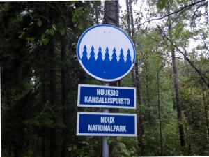 Suomalainen kansallispuistokyltti Nuuksiossa.