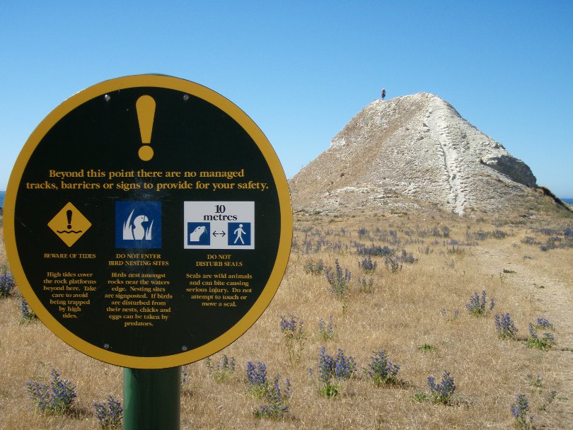 Varoituskyltti Kaikourassa neuvoo mm. olemaan häiritsemättä hylkeitä.