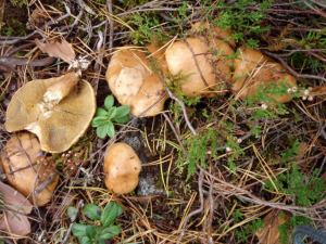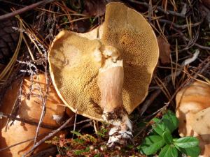 Viikonlopun ensimmäiset kohtaamani tatit olivat arvioni mukaan nummitatteja. Niillä oli erikoisen, suorastaan epäilyttävän suuret pillit, jotka olivat suunnilleen samaa sävyä kuin lakikin. Ilman sienikirjaa olisin analysoinut ne jonkinmoisiksi valetateiksi, mutta ihan syötäviä ne olisivat ja ihan oikeita tattea. Nämä kaikki vaan olivat aina sillä tavalla pehmeitä, että lakki ei taittaessa naksahtanut rikki, vaan venyi sitkeänä. Myös pienet olivat tällaisia sitkeitä ja jäivät keräämättä, vaikka niitä herkullisen näköisesti kasvoi paikoin paljon.