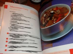 Ekaksi vinkki, että mausteisissa curryruoissa ei ole juuri väliä, mitä vihanneksia käyttää. May Kaidee´sin kokkauskirjan ohjeissa onkin hauskaa, kun neuvotaan laittamaan ”kourallinen vihanneksia”. Massaman curryyn kuitenkin kuuluu peruna, mutta kaikki muu voi olla mitä vain (minimaisseja, paprikaa, sieniä, porkkanaa, tomaattia, kukkakaalia, parsakaalia, kaalia, parsaa, sokeriherneitä jne.).