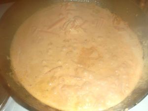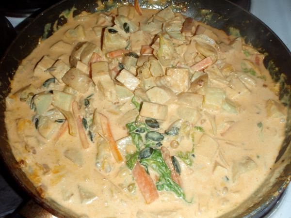 Seuraavaksi lisää joukkoon kookosmaitoa tai kaura- tai soijakermaa. Koostumuksesta pitäisi tulla mukavan paksua. Lisää joukkoon soijakastike, sokeri ja loput vihannekset ja tofut.