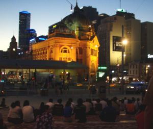 Biitsin ja St Kildan kahvilakatujen lisäksi kaupungin kivoin paikka oli keskustassa hienon (eli vanhantyylisen) Flinderes Street -rautatieaseman vastapäinen Federation Square -aukio, jossa ihmiset istuskelevat tasanteilla tai juovat terassilla tosi kalliita kahveja. Meidän siellä istuskellessa aukiolla oli jotain esityksiä.