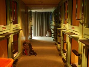 Tokiossa kapselihotelli osoittautui suunnilleen dormin hintaiseksi ja ehdottomasti suosittelen tätä vaihtoehtoa. Ainakaan tämä kapselihotelli ei juuri eronnut dormista muuten, kuin että kerrossänkyjen sijaan kömmittiin sängyn kokoisiin kapseleihin, joiden aukon sai suljettua rullaverholla. Rinkkoja säilytettiin käytävällä ja kaikilla oli myös lukollinen pieni kaappi. Japanilaista erikoisuutta oli myös, että kaikki saivat tohvelit ja yövaatteet. Lisäksi pari kerrosta ylempänä oli kylpyosasto, joissa oli japanilaistyyppisen pesujakkarat hanojen edessä ja matala kuumavesiallas. Aivan ihanaa sateisen päivän päätteeksi. Kaikissa kapselihotelleissa ei kuitenkaan ole naisille osastoja paikkoja, koska niissä yöpyy lähinnä salarymanit. Pariskunnat joutuvat myös yöpymään eri osastoilla.