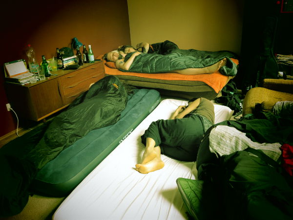 Aika sellainen vapaamatkustaja meikäläinen tällä reissulla, hang-aroundi. Saan samat edut kuin artistit, eli ilmaiset majapaikat, ruokaa ja välillä juomaakin tarjotaan. Kyllä kelpaa. Kun olen ajanut pari sataa kilsaa voin katsoa olevani jopa hyödyllinenkin. No, maksan osan auton toverivuokrasta ja bensoista. Matka tulee halvemmaksi kaikille.