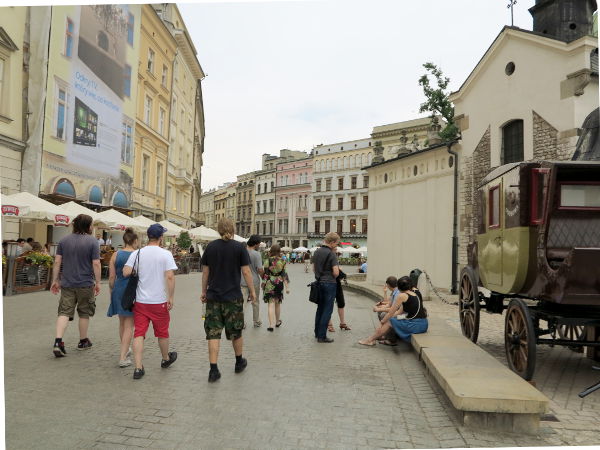 Tässä vaiheessa matkaa taisi alkaa todella kuumat säät. Farkut olivat jo vaihtuneet mekkoihin ja lenkkarit sandaaleihin. Matka kesti ja kesti, eikä Krakovaan jäänyt niin paljon aikaa, kuin aamulla vielä olimme ajatelleet. Keikkapaikka Bomba sijaitsi ihan keskustassa vanhassa kaupungissa. Siitä oli pari korttelia keskusaukiolle, jossa parveili turisteja. Maisemat olivat vaihtuneet niin rivakasti, että olisi voinut hyvin luulla, että vaikkapa Prahassa tässä ollaan. Hello Prague!