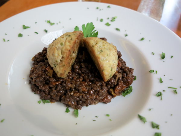 Tilasin annoksen, jossa alla oli melko suolainen muhennos linsseistä ja aurinkotomaateista. Päällä oli kaksi mykyä. Tämä oli kai itävaltalaistyyppistä ruokaa, raskasta ja suolaista. Annos oli myös vähän pieni, joten menin myöhemmin vielä uudestaankin syömään. Kiinalainen ruoka on yleensä aina varma valinta. Niistä saa aina kasvisruokaa, joka on mukavasti maustettua ja jossa on vihanneksia. Niin oli nytkin.