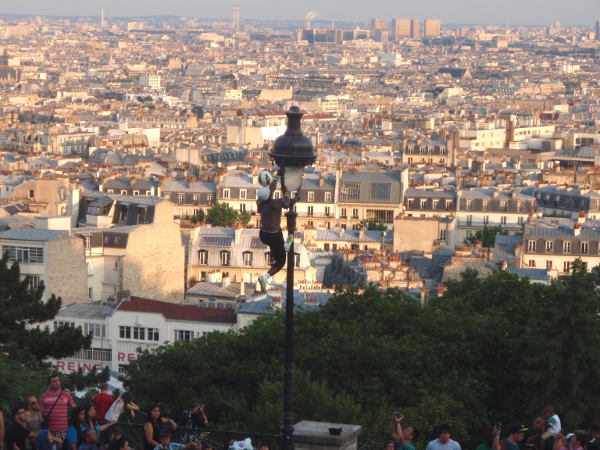 Päivän päätteeksi hyvä paikka on Montmartren Sacre Coeurin kirkko. Montmartren suuntaan kävellessäni näin kirkon pilkistävän rakennusten takaa ja suunnistin sinne. Sieltä avautui panoraamanäkymä Pariisiin. Jalkapallotaiteilumestari Iya Traoré kiipesi katulamppuun palloa tasapainoitellen. Rappusilla istui paljon ihmisiä maisemia ihaillen ja kylmää olutta kaupusteltiin. Kirkkokin oli upea auringossa paistatellen. Pari eri ukkelia yritti tehdä tuttavuutta ja minua ärsytti, koska en kaipaa uutta seuraa ja kannoilta karistaminen tuo pahan mielen. Jostain kuului capoeira-musiikkia ja se osoittautui pienimuotoisten capoeira-festareiden tilaisuudeksi upeassa vanhassa amfiteatterissa.