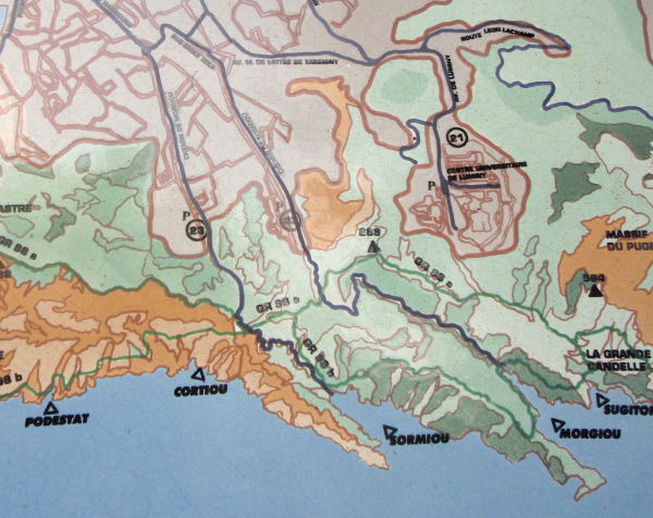 Varsinkaan Sormioulle mennessä ei ollut kävelijöille opasteita. Pitää vain arvioida, mikä olisi hyvä reitti. Kavuttuani ylös kukkulalle valitsin eri suuntaan lähtevän polun kuin mikä olisi selvästi lähtenyt suoremmin alas rannalle. Seikkailin poluilla ja lopulta oli rannalla 1 t 15 min siitä kun olin hypännyt bussista. Takaisin palasin suorempaa polkua ja matka autoportille rannalta kesti 40 min ja siitä pysäkille vielä kymmenisen minuuttia. Sormioun reissun voi siis toteuttaa alle neljässä tunnissa Marseillen keskustasta käsin.