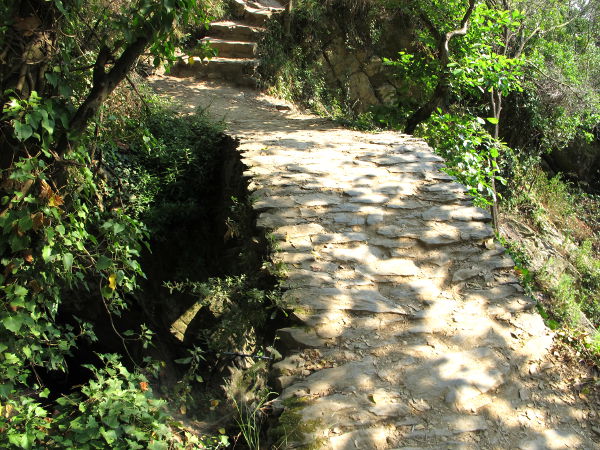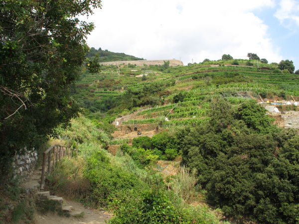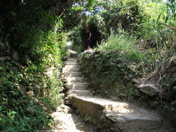 Vaikka kyseessä oli ”sininen polku”, niin se ei ollut mitenkään helppo kavuta. Kun nämä siniset polut Corniglian ja Riomaggioren välillä olisivat (nyt ne olivat kiinni) korkeusvaihteluiltaan vähäisiä, niin tässä oli ensin kauheasti ylösmenoa ja sitten alasmenoa. Lopuksi jalat olivat aika hytelöä. Muistaakseni tällä pätkällä alkumatkasta oli jyrkkien kivirappusten varrella juomanmyyntikoju. Ihme, ettei niitä ollut enempää näillä poluilla, luulisi kaupan käyvän hyvin ja vaikka joidenkin lasten haluavan myydä sitruunamehua turisteille silloin tällöin, ihan niin kuin Aku Ankassa…