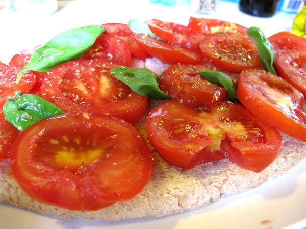 Levantossa söin bruchettaa miltei joka päivä. Rapsakkaa, mutta mehevää leipää (mutta ei yleensä patonkia) , jonka päällä oli oliiviöljyä, kypsää tomaattia ja basilikaa. Joskus tomaatit ja basilikat oli pilkottu, mutta joskus tomaatti oli ihan vain viipaleina ja basilikan lehdet kokonaisina. Toimi sekin ihme kyllä. Ainakin Riomaggioressa nämä olivat hakkeluksena, jossa oli ehkä vähän valkosipulia ja ehkä myös vähän suolaa ja pippuria, kukaties hyppysellinen sokeriakin. Mutta nämä eivät välttämättä tee tomaattibruschetasta sen parempaa.