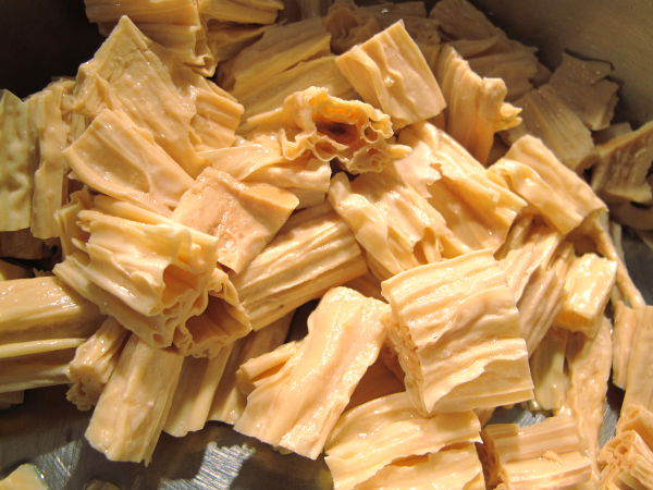 Liota yubaa huoneenlämpöisessä vedessä pari tuntia (minä liotin sitä yön yli jääkaapissa). Valuta vedet pois. Leikkaa yuba-puikot lyhyemmiksi paloiksi.
