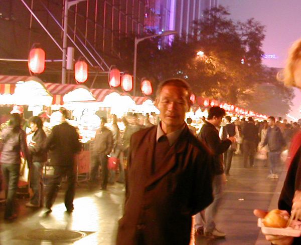 Pekingissä oli pitkä iltatorikatu, jonka monista kojuista piti saada ruokia eri puolilta Kiinaa. Useista kojuista löytyi kuitenkin ihan samat ruoat. Monista kojuista löytyi kyllä erilaisia tofuja, sieniä ja kasviksia, mutta niistä valmistetut ruoat eivät maistuneet kummoisilta. Lähinnä tuotteelta itseltään ilman erityisempiä mausteita tai kikkoja. Kokeilimme monenlaista, mutta esimerkiksi jonkinlaiset munkit olivat mauttomia. Heti ne kelpasivat yhdelle nuorelle parille. Myös joku toinen ei-mieleinen annoksemme sai ottajan.