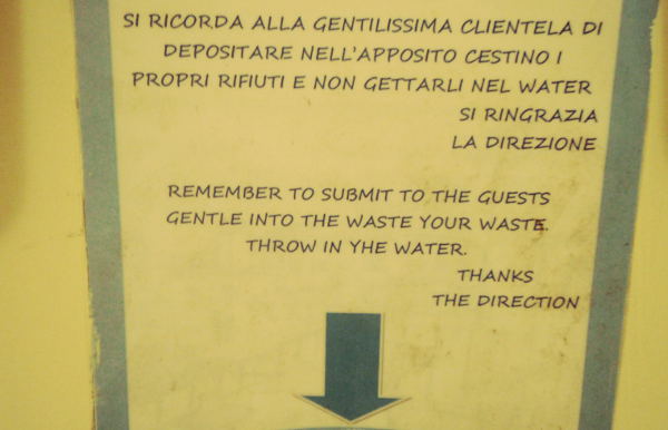 Nimenomaan varoituskylttejä oli käännetty englanniksi tai miksi lie kieleksi. Moottoritien varrella luki: ”Many accidents hapen in that neighborhuud”, kun tarkoitus oli varmaan varoittaa vaarallisesta tiestä. Yangtse-joen laivalla varoitettiin kolauttamasta päätä: ”Meet and discuss with care”.
