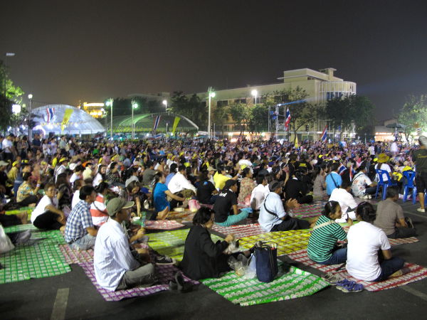 Sinne kuului megafoniin tms. huudettuja puheita ja kannustushuutoja. Ensin luulin jonkun luukuttavan televisiolähetystä, äänet kun kuuluivat väärästä suunnasta eli kaistaleelta hotellini ja leveän Chao Phraya -joen väliltä. Äänet kuitenkin vähitellen etenivät ja lopulta kaikkosivat. Varmaankin yksi Government Housen mielenosoituspaikalle etenevistä letkoista kulki viereistä Prha Athit/Sumen -tietä ja siitä eteenpäin Samsen Roadia.