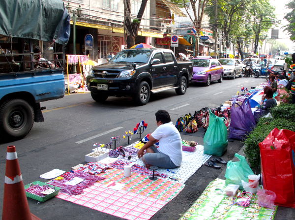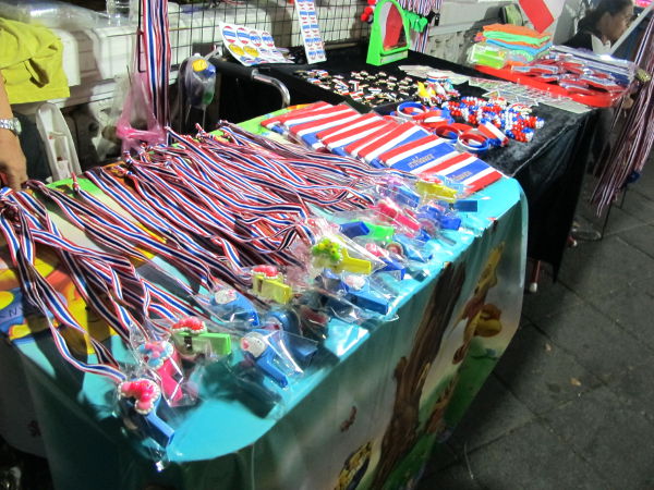 Näyttää siltä, että Ratchadamnoen Klangille on mielenosoittajille pystytetty ensiapupisteiden lisäksi omat jalkahierontapisteensä ja heille näytetään jaettavan ilmaisia juomapulloja. On kerrassaan hupaisaa, miten katukaupustelijat ovat käyttäneet tilaisuuden hyväkseen ja myyvät monenlaista thailippukrääsää mielenosoittajille ja sen tukijoille. On paljon erilaisia t-paitoja, lippuja, kilistimiä ja kolistimia sekä päähineitä. Katselin kauppiaiden ostaneen thailippuraitaista nauhaa ja päällystävän sillä mm. aurinkolasien sankoja ja hiuspantoja. Keltaisia paitoja ei enää näy ihmisten päällä.