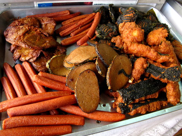 Tilasin kiinnostavat grillatut kasvispallerot. Niistä oli kuva menussa ja näen jatkuvasti samannäköisiä vaaleanpunaisen harmaita kala- tai lihapalleroita katujen ruokakojuissa. Näiden kasvisversiot olivat juuri niin rapsahtavan kumisia kuin miltä näyttivätkin. Ne oli tehty varmaan konnyakusta, josta tehtyjä palleroita olen syönyt mm. taiwanilaista kasvisruokaa tarjoavassa ravintolassa. Olen myös syönyt samantapaista ainetta olevia kasvissashimeja Bangkokissa japanilaisessa kasvisravintolassa. Siellä ne olivat ihan mauttomia. Nämä grillatut pallerot sentään hieman maistuivat.