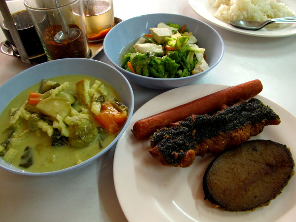 Hienoa kun ihan KSR-seudulta löytyy tällainen perinteinen kasvisthai-kiinalaispaikka, jossa käyvät paikallisetkin! Valikoima oli samanlainen kuin muissakin vastaavissa Thaimaan kasvisravintoloissa, joissa on tiskillä valmiiksi tehtyjä ruokia, kuten currykastikeita, erilaisia paistettuja vihanneksia ja tofuja. Yleensä niistä saa annokseen lisäksi erilaisia feikkilihoja, kuten nakkeja, leikkeitä ja pyöryköitä.
