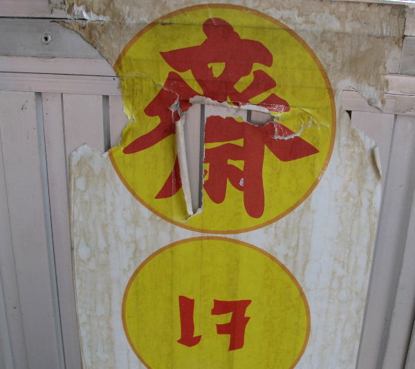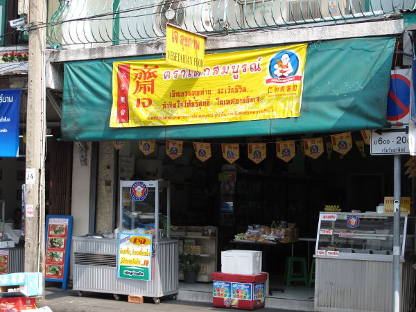 Lähdin etsimään Jae Kae -nimistä kasvisravintolaa Thanon Mahanop -kadulta, mutta kulman takaa ennen sitä löysin toisen kasvisravintolan, jonka nimi ei selvinnyt. Bongasin paikan vegetarian -tekstistä ja jos olisin ollut tarkkasilmäinen, olisin tunnistanut sen ensin keltaisesta kyltin väristä (se ei sinänsä vielä takaa mitään) ja kiinalaisesta ja thaimaalaisesta kasvisruoan merkistä banderollissa.