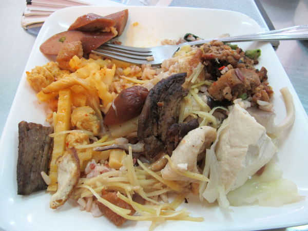 Söin paikassa aamiaiseksi papaijasalaatin. Paitsi että papaijasalaatti yleensä sisältää kalakastiketta ja katkaraputahnaa, on se myös tulinen salaatti, mikä haittaa syömistä. Nyt totuttelin jo ennen reissuun lähtöäni syömään chiliä ja uskaltauduin tilamaan salaatin ei-mietona.