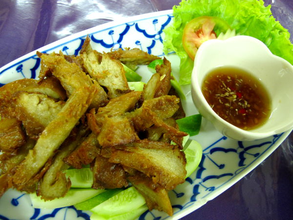Lisäksi tilasin annoksen ”deep fried vegetarian duck”. Ihan loistavaa soija- tai seitanhässäkkää oli sekin makean kirpeän dippisoossin kera. Harmi kun muina päivinä ravintola oli poikkeuksellisesti jostain syystä kiinni. Ruoat maksoivat yhteensä 160 bahtia (4 euroa) + 20 bahtilla ostin alkunälkään suolaista purtavaa.