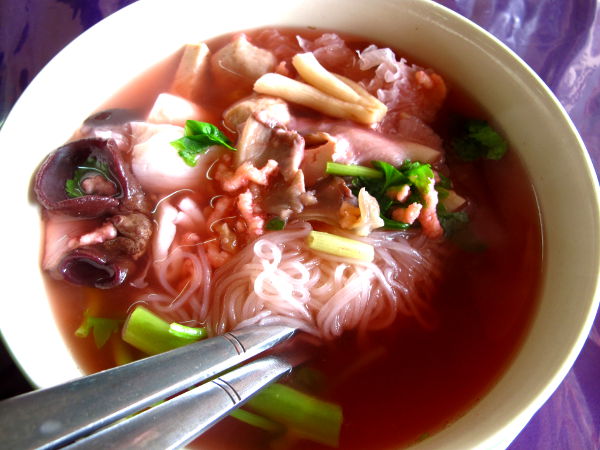 Katseltuani aikani ihmisiä ryystämässä nuudelisoppiansa Bangkokin kaduilla halusin sitä minäkin. Tilaamani ”noodle soup” (listalla oli muitakin erilaisia nuudelikeittoja) ei ollut oikein mitään mitä koskaan aiemmin olen syönyt. Luulin kyllästyväni tumman liemen vahvaan aromiin, mutta keitto oli hyvää loppuun asti moninaisine makuineen. Kasvimakkaran, seitanin ja konnyakupalleroiden lisäksi keitossa oli sientä ja vihreitä vihanneksia. Thaimaalaiset ovat kiinnostuneita nuudeleistaan ja minultakin kysyttiin haluanko nuudelini leveämpinä vai kapeampina.