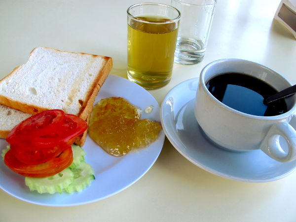Chumponin hotellissani hintaan kuului aamiainen. Harmillisesti thairuoat eivät olleet vegaanisia, joten söin todella ankeasti paahtoleipää marmeladeilla sekä kurkulla ja tomaatilla. Juomana krysenteemimehua (kannattaa maistaa, koska se on suosittua Aasiassa) ja mustaa kahvia. Myöhemmin tajusin, ettei tämäkään satsi varmaan ollut vegaaninen, koska paahtoleivissä on yleensä ainesosana maitoa ja munaa.