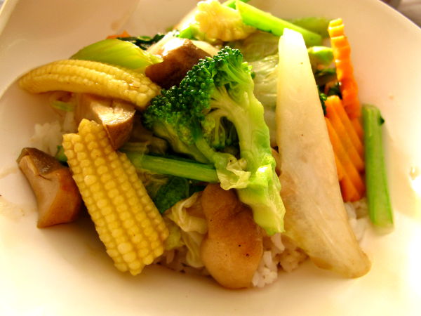 Paistetut vihannekset riisipedillä 89 bahtia Pattayan Jomtienillä.