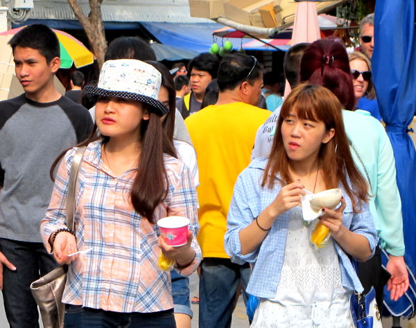 Thait pyörittelevät ja mutustelevat ruokaansa, lisäilevät mausteita ja hoitavat varsinaisen syömishomman hitaasti, vaikka siinä onkin tekemisen meininkiä. Kaduilla kaikki paitsi papaijasalaatin sekoitus ja skootterin ajo tapahtuvat verkkaisesti. Tiesin kyllä etukäteen thaiden kävelevän hitaasti, mutta nyt olen huomioinut kaikenlaista muutakin aikailua.