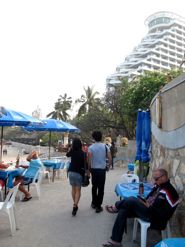 Samalla tavalla kuin Pattayallakin, on Hua Hinin kaupungin kohdalla hiekkarannalla paikoin oikein tiheästi varjoja ja tuoleja. Varjot ovat niin tiheästi, että ne muodostavat katon. Nuo kohdat ovat varmaankin suunnattu thaituristeille, jotka eivät halua maata auringossa, mutta joita rannalla olo silti kiehtoo. Usein heillä oli pöydälle katettu paljon ruokaa. Tuollaisessa matalakattoisessa hämärässä minua ei kiehdo oleskella.