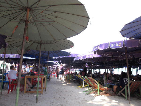 Rannalla ei juuri ollut kivoja ravintoloita, joissa istua ja katsoa merta. Hiekkaranta oli omistettu auringonotolle ja ruokaa sai lähinnä aurinkotuoleilla syötäväksi tämän kuvan katoksen muutamaa pöytää lukuun ottamatta.
