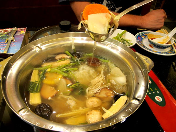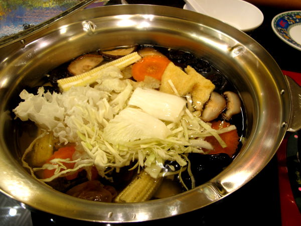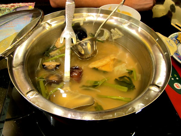 Keskellä pöytää on keittolevy ja kattila. Tilauksemme jälkeen MK:ssa kattilaan kaadettiin kuumaa lientä (toivottavasti se oli kasvislientä). Tilasimme siitakesieniä (40 bahtia) ja ison Special Vegetables Setin (245 bahtia), jotka tuotiin pöytään pikaisesti. Saimme samoin dippikastiketta (toivottavasti se oli vegaanista) ja krysanteemimehua, joita sai pyytäessä lisää.