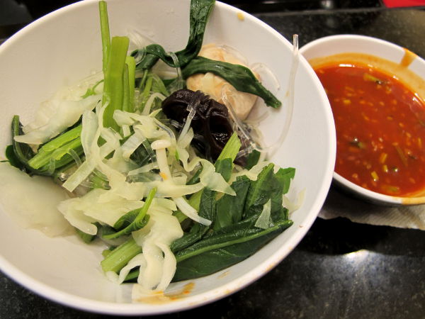 Olimme aika hämmentyneitä oikein toimimisen suhteen. Heitimme ensin liemeen porisemaan sellaisia vihanneksia, joiden kypsyminen kestää pisimpään. Lopulta laitoimme joukkoon kaiken muunkin. Voi olla että pitkään ja hartaasti ruokailevat keittelevät yhden suupalan kerrallaan, mutta siinä hommassa kestäisi ikuisuus. Meidän tyylimme oli oikein hyvä. Otimme padasta vihanneksia, sieniä, tofua ja lasinuudelia vähän kerrallaan kippoihimme ja sotkimme dippisoossia joukkoon. Ainekset pysyivät rapsakoina. Lopuksi liemi oli maustunut aineksista ja minä ainakin tykkäsin sitä ryystää.