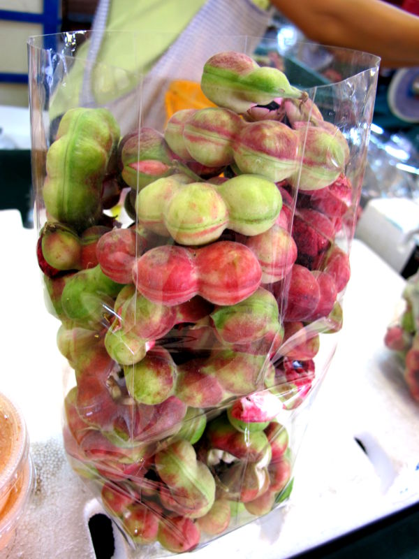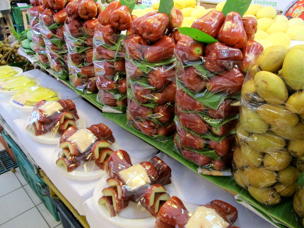 Vesiomenoita. Ne ovat melko mauttomia, mutta ihanan rapsakoita. Vesiomenan nimi sopii hyvin, koska rapsakkuudesta huolimatta ne ovat vetisiä ja miedosti omenan makuisia.Tämä hedelmä näyttää vähän vesiomenalta, mutta sen muoto näyttäisi olevan pyöreämpi ja sisällä on iso kivi. Ehkä se silti on vesiomena.Ihan pienet mandariinit ovat makeita.Thaimaasta saa maailman parasta mandariinimehua. Sitä sanotaan appelsiinimehuksi, mutta se on tehty pienemmistä tangeriineista, mandariineista tai mistä lie.Ulkomailla alkaa aina ihmetyttämään, miksi Suomeen tuodaan vain yhdenlaisia banaaneja. Niitä kuin olisi erimakuisia pieniä ja suippoja, pieniä ja paksuja, keskikoisia ja hedelmäisiä, minikokoisia…Kaffirlimettejä. Suomalaisille nämä ruttuiset limetit ovat tutuimpia niiden lehtien takia, koska ne ovat yksi thairuokien pääyrteistä.Rambutaneja. Niiden päällä on kumimaisia karvanystyjä. Sisällä on valkoista hieman läpikuultavaa hedelmälihaa ison siemenen ympärillä. Samanmakuisia ja -tapaisia hedelmiä ovat litsit eli lycheet ja longanit.Tämä langsat-hedelmä näyttää ulkoisesti samantapaiselta kuin longanit, mutta ne kasvavat tiheämmin tertussa ja ovat vähän suurempia ja vähemmän pyöreitä kuin longanit. Sisältä ne ovat läpikuultavan valkoisia kuten longanit, mutta hedelmäliha on jakautunut samaan tapaan kuin mangosteeneissa. Sisällä ei ole kiviä kuin ehkä yksi pienen pieni. Maku on ihan omanlaisensa ja kestää hetken ennen kuin pääsee sen mukaan. Minulla toisaalta tuli stoppi kun kuulin sen makua verrattavan muikkuun…Papaija on Thaimaan perushedelmiä, joka toisinaan on mukana ravintoloidenkin hedelmäannoksissa. Kätevintä se on syödä kun sen ensin halkaisee, poistaa lusikalla siemenet ja lusikoi hedelmälihan suuhunsa.Pithaya on koristeellinen, mutta aika tylsän makuinen hedelmä. Silti sitä on mukava välillä maistaa, koska sen koostumus on mukava.Durian on jumalainen hedelmä, jota ei saa joka nurkalta.Duriania. Takana kokonaisia durianeja ja edessä pakattua hedelmälihaa, jonka sisällä on isoja siemeniä. Durianit ovat kalliimpia kuin useimmat muut hedelmät.Iso jakkihedelmä avattuna.Näitä piikikkäitä hedelmiä kutsutaan indonesialaisen nimensä mukaan salakeiksi, englanniksi snakefruitiksi ja thaiksi rakamiksi. Piikit ovat pisteliäitä, mutta eivät uppoa ihoon. Näiden ostamieni hedelmien kuoren alla hedelmä oli osin mätää, kuivahtanutta ja syömäkelvontonta.Usein salakeja löytyy valmiiksi kuorittuna. Vaikka niiden ostaminen ei ole niin hygieenistä kuin kuorineen ostaminen, niin ainakin paremmin näkee hedelmän kunnon. Nämä olivat liian kirpeitä eivätkä niin hyviä kuin Indonesiassa syömäni salakit.Kaupungeissa hedelmiä saa ostettua hedelmäkärryistä kätevästi valmiiksi pilkottuina. Joillain rannoillakin kiertää hedelmänmyyjiä. Ananakset ovat yleensä makeita, mutta joskus niitä tarjotaan liian raakoina.Camachile on tamarindin muotoinen mutta hempeän värinen aika mauton ja kuiva hedelmä.Avatut camachilet.Pomeloita torilla.Hedelmätori Bangkokissa.Thaimaan hedelmälautastarjonta ravintoloissa on yksipuolista.Joskus hedelmiä myydään tällä tavalla kelmutettuna. Kuorittuja hedelmiä en tykkää ostaa muuten kuin kylmässä pidettynä.Hedelmiä torilla. Mangosteeneja, longaneita jne.