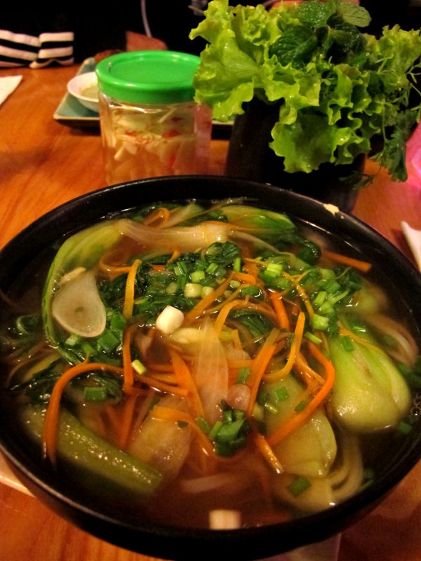 Menussa on monen sorttista ruokaa, mutta alkuihastukseni jälkeen huomasin, että vegaanisia annoksista oli ehkä korkeintaan puolet. Ensimmäisellä kerralla otin nuudelikeittoa, jota Vietnamissa kutsutaan phoksi, vaikka pho tarkoittaakin litteitä riisinuudeleita, joita saatetaan tarjota ilmankin lientä. Pho on kai jonkinlaista kansallisruokaa, mutta katukeittiöistä sitä ei taida oikein kasviksena saada. Siksi sitä on hyvä ryystää kasvisravintoloissa, Vietnamissa kun ollaan.
