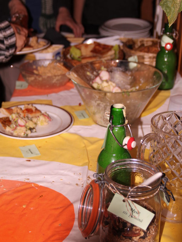 Aloitin kierrokseni brunssilla Pasilan Rauhanasemalla. Seitannakit ja tofukokkeli vetosivat. Lopulta kuitenkaan nämä eivät edustaneet brunssin parhaimmistoa, vaan parasta oli brunssipöydästä vapaasti otettava perunasalaatti, tapenade, hummus ja jälkiruoista uuniomenaviipaleet vaniljakastikkeella. Myös focaccia oli kuulemma tosi hyvää. Nakkia ja tofua tuotiin pöytään annosteltuna, mikä on ymmärrettävää koska buffetista voin kuvilla että porukka olisi rohmunnut nakkeja, jotka olisi huomanneet tuhdeiksi. Seitannakki oli aika pieni, mutta ihan sopiva ja ok makuinen. Tofukokkeli taas olisi vaatinut enemmän mausteita, vähintään suolaa ja lisää paistamista. Mutta brunssi oli hirmu halpa, 8 euroa, eli oikein hyvä homma. Tuotot menivät Aseistakieltäytyjäliitolle.