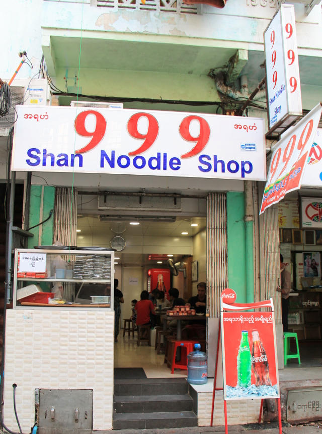 Tämä paikka kannattaa kokea Yangonissa, jossa muutoin minusta tuntui hankalalta ajatukselta tilata paikallista ruokaa kasviksena, varsinkin kun ruokailu tapahtuisi jalkakäytävällä tosi ahtaasti. Shan Noodle Shopia oli suositeltu Happy Cowssa ja se oli myös mainittu Lonely Planetissa. Tämä oli intialaisten halpisravintoloiden oloinen pieni paikka, jossa etenkin nainen kassan takana puhui täydellistä englantia. Teekuppia täytettiin ja palvelu oli hyvää. Burman sisälläkin on kai monia ruokakulttuureja ja tämä paikka edusti shan-kansan tyyliä. Ruoka ei ollut muualta Yangonista tuttua intialaistyylistä ja menu koostui suurimmaksi osaksi vain hiukan toisistaan poikkeavista nuudeliannoksista.