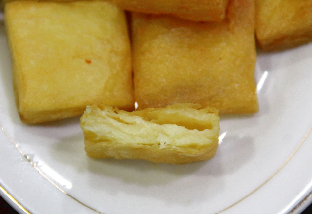 Olisin halunnut semmoista tofuvanukkaan näköistä kellertävää tofuntapaista ruokaa, mutta sitä ei ollut. Sen sijaan tilasin listalta löytyvää paistettua tofua. Olin tästä lukenut, että se on shan-tofua, eli shan-kansan ”tofua”, joka on oikeasti jotain hyydytettyä kikherne- tai muusta papujauhosta tehtyä pehmeää keltasävyistä tofumaista ruokaa. Menun kuvassa se näytti kevyesti paistetulta pehmeältä tofulta, joten oli vähän pettymys saada lautasellinen kovaksi friteerattuja paloja. Ne eivät oikein maistuneet, vaikka tavallinen friteerattu tofu olisi voinut maistuakin. Tämä shan-tofu oli liikaa jonkun friteeratun taikinan oloista tunkkaista pureskeltavaa.