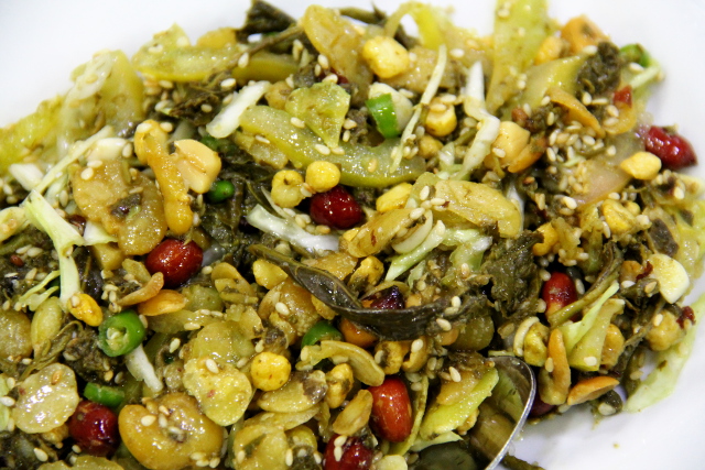 Tilasin vielä teelehtisalaatin, josta minulla oli ennestään hyvä kokemus Chiang Maissa. Nyt kuitenkin salaatti oli liian tuhti ja suolainen. Se olisi pitänyt syödä riisinuudeleiden tai riisin kanssa, tai mieluiten joukossa olisi saanut olla vaikkapa tuoretta tomaattia yhtä paljon kuin tätä teelehtisalaattia. Hyvin tuo salaatti oli maustettu, mutta eihän tuommoista voinut syödä kokonaan. Pikkelöityjen teelehtien lisäksi joukossa oli mausteita (valkosipulia, chiliä ja vissiin etikkaa ja soijakastiketta), kuivaksi friteerattuja härkäpapuja ja herneitä sekä liian vähän tuoretta kaalia ja paprikaa.