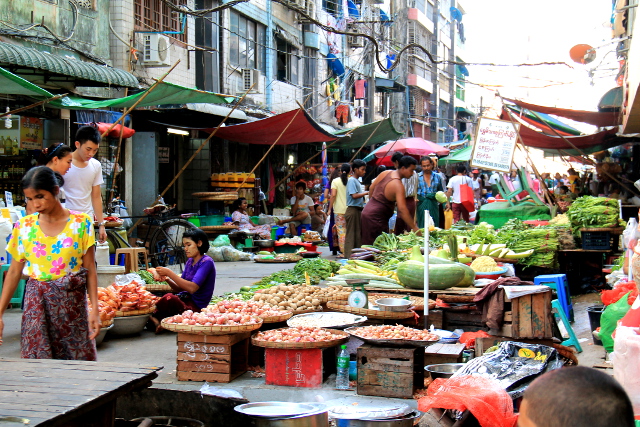 Yangonista varmasti löytyy torejakin, mutta ne eivät ole niin tarpeellisia, koska kaduilla myydään kaikkea. No, onneksi ei sentään raakoja lihatuotteita, mutta kaikenlaiset kasvikset, sienet ja hedelmät ovat edustettuina.