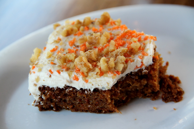 Emme ehtineet syömään täällä varsinaisia ruokia, mutta valitsin kakkupaljoudesta porkkanakakun, jota tuli valtava palanen. Ikävä kyllä se ei ollut mitään loistavaa. En tykkää jos kakkujen tai kuppikakkujen kuorrutteena käytetään öklömargariinista kovahkoa kuorrutetta ja tässä oli juuri semmoista. Harmi vain.
